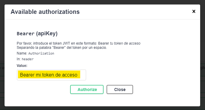 Luego completar el cuadro con la palabra "Bearer" seguida de un espacio y luego copiar el token obtenido como respuesta al hacer una solicitud al endpoint de login.